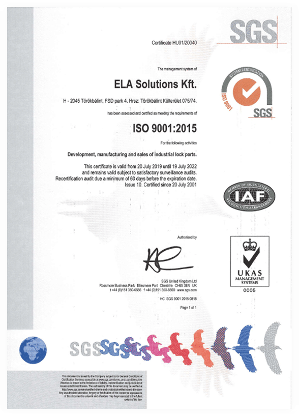 Die Geschäftsführung von ELA SOLUTIONS Kft. betrachtet, neben ihrer kontinuierlichen wirtschaftlichen Entwicklung auf dem internationalen Industriemarkt, die Qualitätssicherung nach Vorschriften der MSZ EN ISO 9001:2015 Norm als ihr grundlegendes unternehmerisches Ziel.